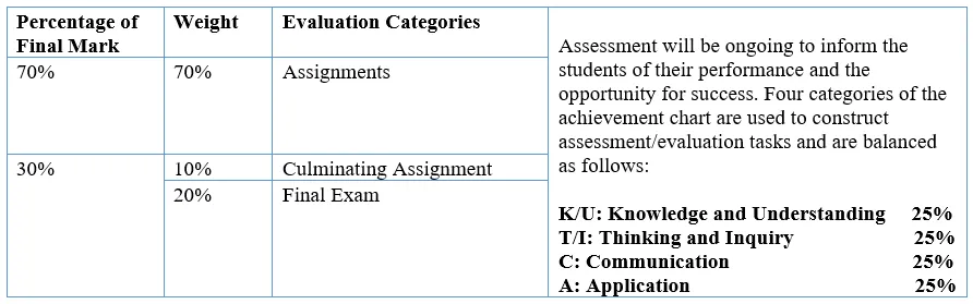 Thirty percent (30%) of the grade will be based on a final evaluation administered at or towards the end of the course. This evaluation will be based on evidence from one or a combination of the following: an examination, a performance, an essay, and/or another method of evaluation suitable to the course content. The final evaluation allows the student an opportunity to demonstrate comprehensive achievement of the overall expectations for the course.