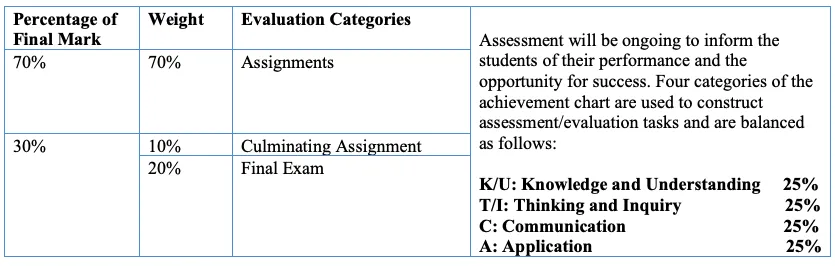 Thirty percent (30%) of the grade will be based on a final evaluation administered at or towards the end of the course. This evaluation will be based on evidence from one or a combination of the following: an examination, a performance, an essay, and/or another method of evaluation suitable to the course content. The final evaluation allows the student an opportunity to demonstrate comprehensive achievement of the overall expectations for the course.