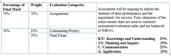 Thirty percent (30%) of the grade will be based on a final evaluation administered at or towards the end of the course. This evaluation will be based on evidence from one or a combination of the following: an examination, a performance, an essay, and/or another method of evaluation suitable to the course content. The final evaluation allows the student an opportunity to demonstrate comprehensive achievement of the overall expectations for the course.