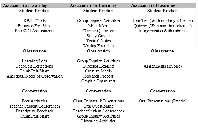 Assessment as Learning: focuses on the explicit fostering of students’ capacity over time to be their own best assessors, but teachers need to start by presenting and modelling external, structured opportunities for students to assess themselves.