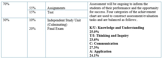 Thirty percent (30%) of the grade will be based on a final evaluation administered at or towards the end of the course. This evaluation will be based on evidence from one or a combination of the following: an examination, a performance, an essay, and/or another method of evaluation suitable to the course content. The final evaluation allows the student an opportunity to demonstrate comprehensive achievement of the overall expectations for the course.