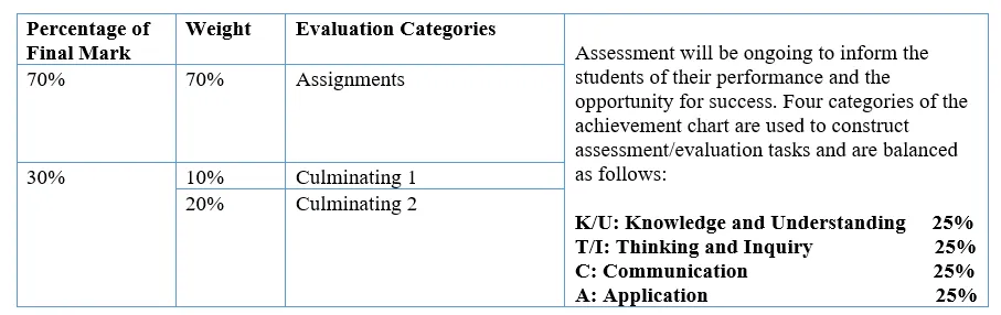 Thirty percent (30%) of the grade will be based on a final evaluation administered at or towards the end of the course. This evaluation will be based on evidence from one or a combination of the following: an examination, a performance, an essay, and/or another method of evaluation suitable to the course content. The final evaluation allows the student an opportunity to demonstrate comprehensive achievement of the overall expectations for the course.