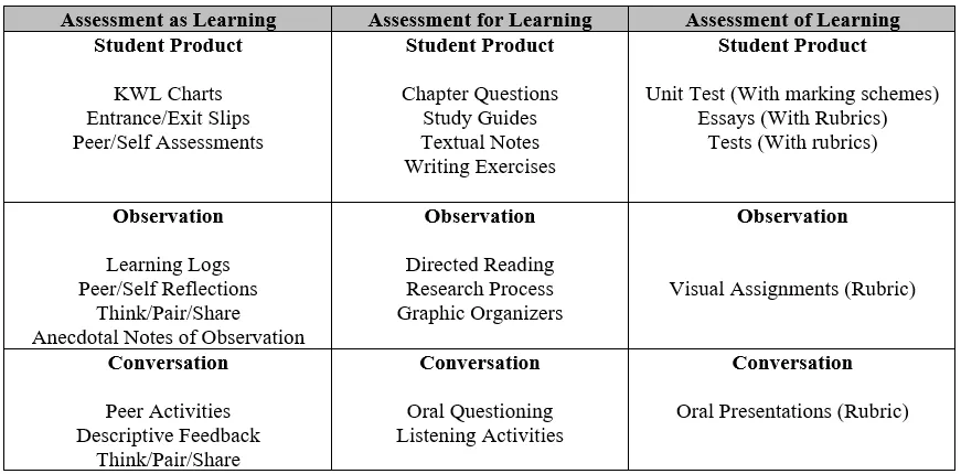 • Assessment as Learning: focuses on the explicit fostering of students’ capacity over time to be their own best assessors, but teachers need to start by presenting and modelling external, structured opportunities for students to assess themselves.