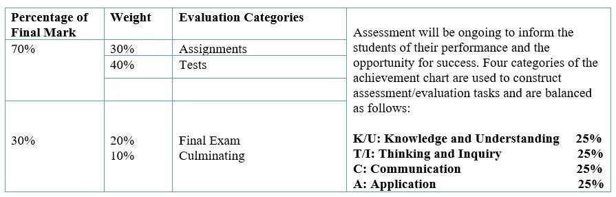 • Thirty percent (30%) of the grade will be based on a final evaluation administered at or towards the end of the course. This evaluation will be based on evidence from one or a combination of the following: an examination, a performance, an essay, and/or another method of evaluation suitable to the course content. The final evaluation allows the student an opportunity to demonstrate comprehensive achievement of the overall expectations for the course.