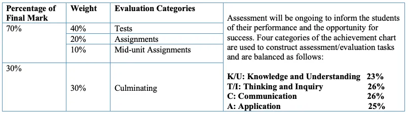 A final grade (percentage mark) is calculated at the end of the course and reflects the quality of the student’s achievement of the overall expectations of the course, in accordance with the provincial curriculum.