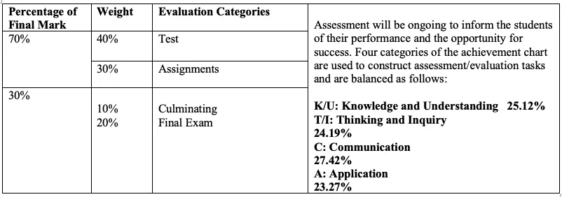 Thirty percent (30%) of the grade will be based on a final evaluation administered at or towards the end of the course. This evaluation will be based on evidence from one or a combination of the following: an examination, a performance, an essay, and/or another method of evaluation suitable to the course content. The final evaluation allows the student an opportunity to demonstrate comprehensive achievement of the overall expectations for the course.