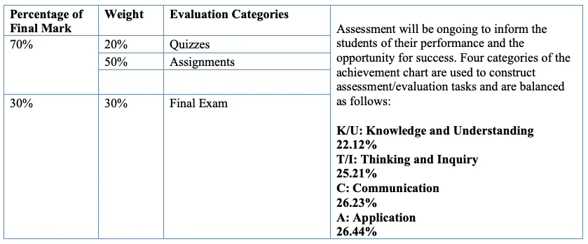 Thirty percent (30%) of the grade will be based on a final evaluation administered at or towards the end of the course. This evaluation will be based on evidence from one or a combination of the following: an examination, a performance, an essay, and/or another method of evaluation suitable to the course content. The final evaluation allows the student an opportunity to demonstrate comprehensive achievement of the overall expectations for the course.