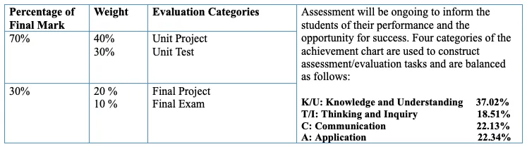 Thirty percent (30%) of the grade will be based on a final evaluation administered at or towards the end of the course. This evaluation will be based on evidence from one or a combination of the following: an examination, a performance, an essay, and/or another method of evaluation suitable to the course content. The final evaluation allows the student an opportunity to demonstrate comprehensive achievement of the overall expectations for the course.