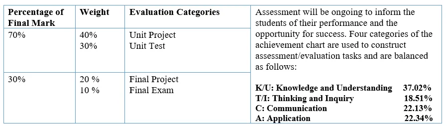 Thirty percent (30%) of the grade will be based on a final evaluation administered at or towards the end of the course. This evaluation will be based on evidence from one or a combination of the following: an examination, a performance, an essay, and/or another method of evaluation suitable to the course content. The final evaluation allows the student an opportunity to demonstrate comprehensive achievement of the overall expectations for the course.