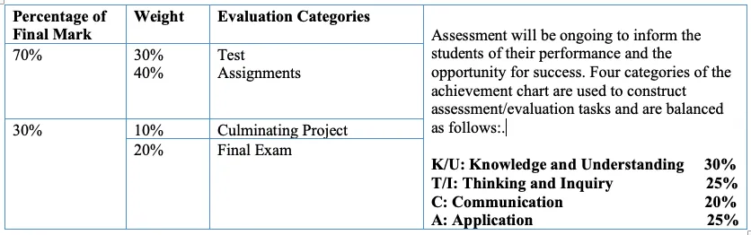 Thirty percent (30%) of the grade will be based on a final evaluation administered at or towards the end of the course. This evaluation will be based on evidence from one or a combination of the following: an examination, a performance, an essay, and/or another method of evaluation suitable to the course content. The final evaluation allows the student an opportunity to demonstrate comprehensive achievement of the overall expectations for the course.