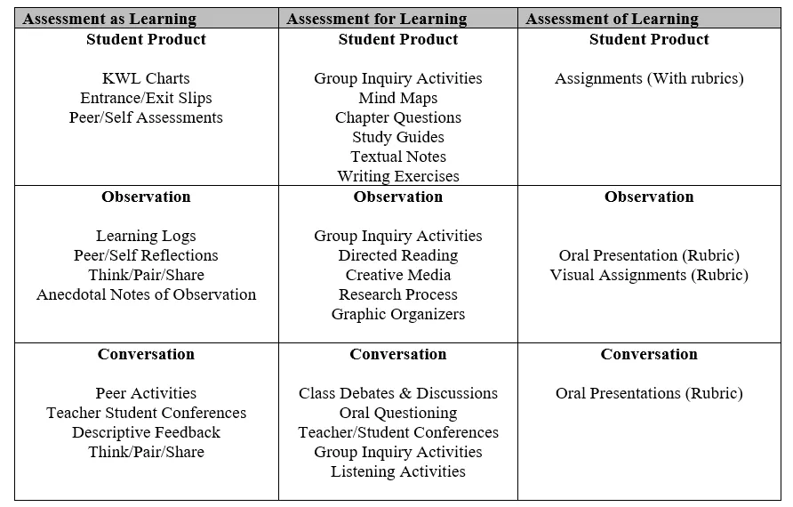Assessment as Learning: focuses on the explicit fostering of students’ capacity over time to be their own best assessors, but teachers need to start by presenting and modelling external, structured opportunities for students to assess themselves.