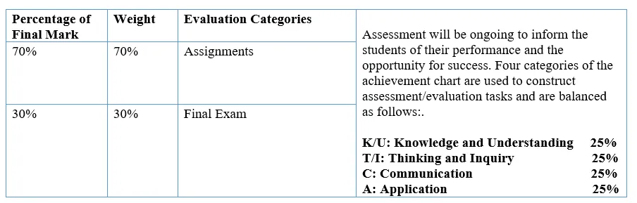 Thirty percent (30%) of the grade will be based on a final evaluation administered at or towards the end of the course. This evaluation will be based on evidence from one or a combination of the following: an examination, a performance, an essay, and/or another method of evaluation suitable to the course content. The final evaluation allows the student an opportunity to demonstrate comprehensive achievement of the overall expectations for the course.