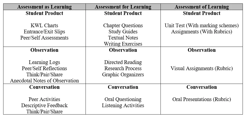 Assessment as Learning: focuses on the explicit fostering of students’ capacity over time to be their own best assessors, but teachers need to start by presenting and modelling external, structured opportunities for students to assess themselves.