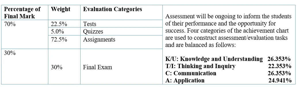 Thirty percent (30%) of the grade will be based on a final evaluation administered at or towards the end of the course. This evaluation will be based on evidence from one or a combination of the following: an examination, a performance, an essay, and/or another method of evaluation suitable to the course content. The final evaluation allows the student an opportunity to demonstrate comprehensive achievement of the overall expectations for the course.