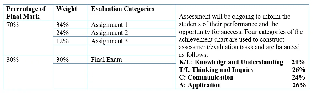 Thirty percent (30%) of the grade will be based on a final evaluation administered at or towards the end of the course. This evaluation will be based on evidence from one or a combination of the following: an examination, a performance, an essay, and/or another method of evaluation suitable to the course content. The final evaluation allows the student an opportunity to demonstrate comprehensive achievement of the overall expectations for the course.