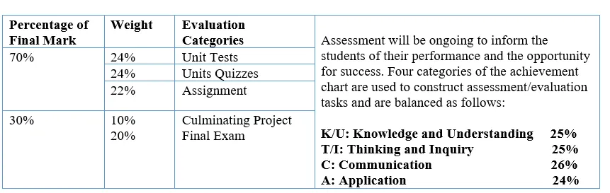 Thirty percent (30%) of the grade will be based on a final evaluation administered at or towards the end of the course. This evaluation will be based on evidence from one or a combination of the following: an examination, a performance, an essay, and/or another method of evaluation suitable to the course content. The final evaluation allows the student an opportunity to demonstrate comprehensive achievement of the overall expectations for the course.