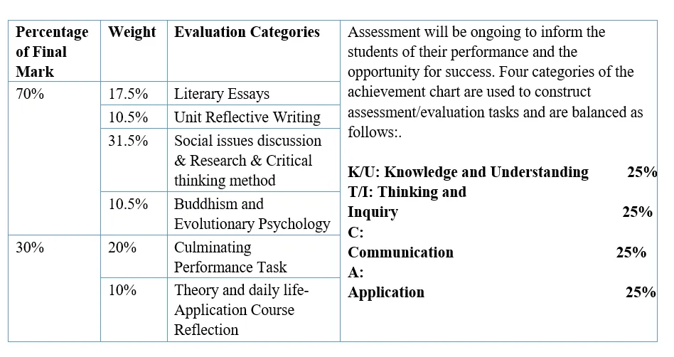 Thirty percent (30%) of the grade will be based on a final evaluation administered at or towards the end of the course. This evaluation will be based on evidence from one or a combination of the following: an examination, a performance, an essay, and/or another method of evaluation suitable to the course content. The final evaluation allows the student an opportunity to demonstrate comprehensive achievement of the overall expectations for the course.