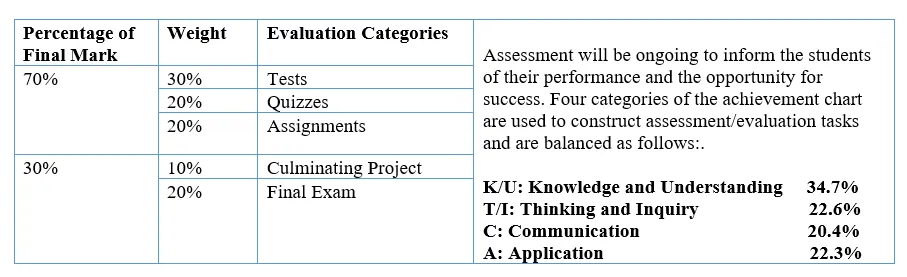 Thirty percent (30%) of the grade will be based on a final evaluation administered at or towards the end of the course. This evaluation will be based on evidence from one or a combination of the following: an examination, a performance, an essay, and/or another method of evaluation suitable to the course content. The final evaluation allows the student an opportunity to demonstrate comprehensive achievement of the overall expectations for the course.