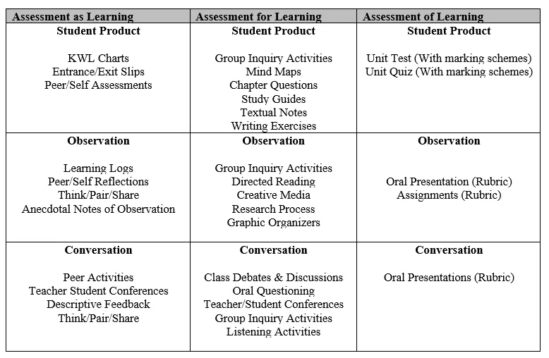 Assessment as Learning: focuses on the explicit fostering of students’ capacity over time to be their own best assessors, but teachers need to start by presenting and modelling external, structured opportunities for students to assess themselves.