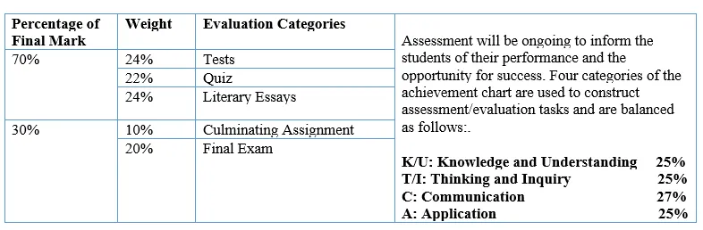 A final grade (percentage mark) is calculated at the end of the course and reflects the quality of the student’s achievement of the overall expectations of the course, in accordance with the provincial curriculum.
