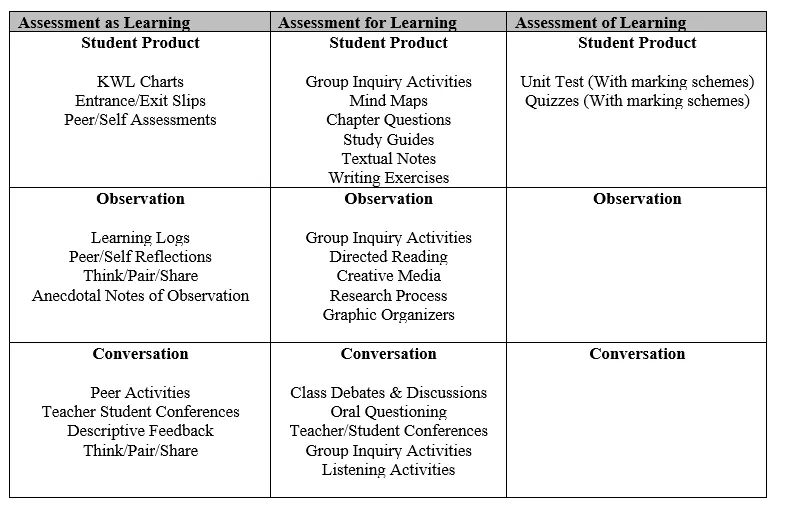 Assessment as Learning: focuses on the explicit fostering of students’ capacity over time to be their own best assessors, but teachers need to start by presenting and modelling external, structured opportunities for students to assess themselves.