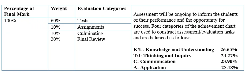 Thirty percent (30%) of the grade will be based on a final evaluation administered at or towards the end of the course. This evaluation will be based on evidence from one or a combination of the following: an examination, a performance, an essay, and/or another method of evaluation suitable to the course content. The final evaluation allows the student an opportunity to demonstrate comprehensive achievement of the overall expectations for the course.