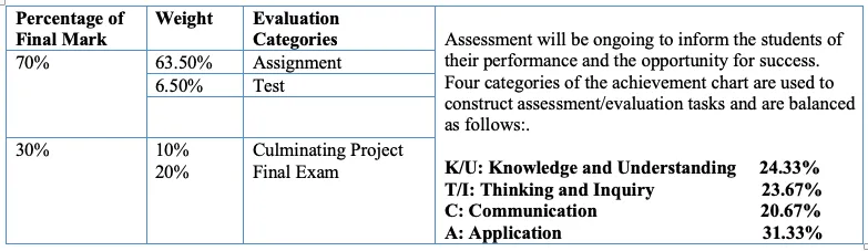 Thirty percent (30%) of the grade will be based on a final evaluation administered at or towards the end of the course. This evaluation will be based on evidence from one or a combination of the following: an examination, a performance, an essay, and/or another method of evaluation suitable to the course content. The final evaluation allows the student an opportunity to demonstrate comprehensive achievement of the overall expectations for the course.