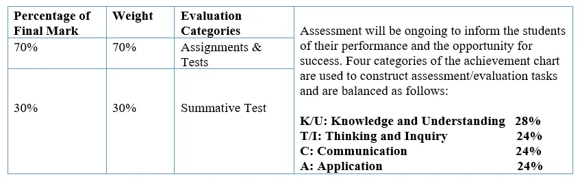 Thirty percent (30%) of the grade will be based on a final evaluation administered at or towards the end of the course. This evaluation will be based on evidence from one or a combination of the following: an examination, a performance, an essay, and/or another method of evaluation suitable to the course content. The final evaluation allows the student an opportunity to demonstrate comprehensive achievement of the overall expectations for the course.