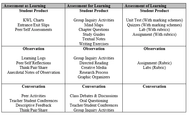 Assessment as Learning: focuses on the explicit fostering of students’ capacity over time to be their own best assessors, but teachers need to start by presenting and modelling external, structured opportunities for students to assess themselves.