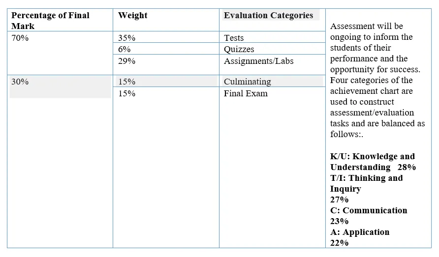 Thirty percent (30%) of the grade will be based on a final evaluation administered at or towards the end of the course. This evaluation will be based on evidence from one or a combination of the following: an examination, a performance, an essay, and/or another method of evaluation suitable to the course content. The final evaluation allows the student an opportunity to demonstrate comprehensive achievement of the overall expectations for the course.