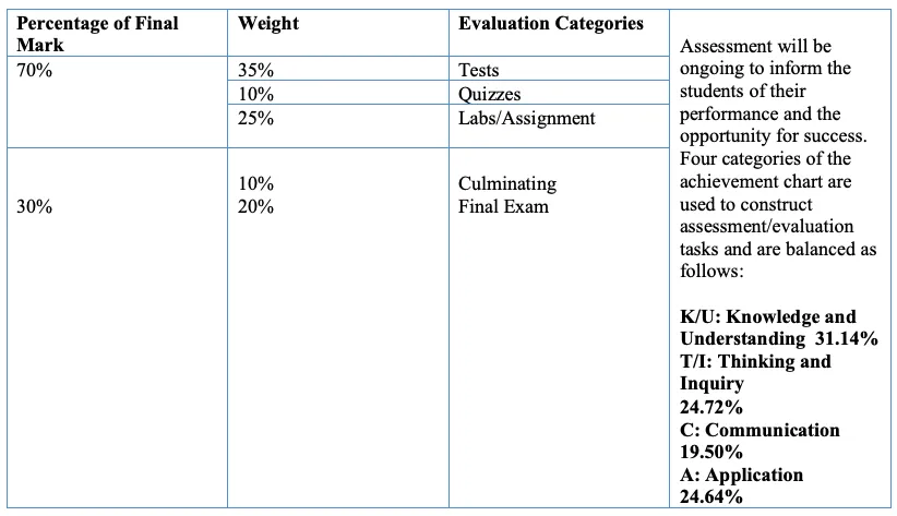 A final grade (percentage mark) is calculated at the end of the course and reflects the quality of the student’s achievement of the overall expectations of the course, in accordance with the provincial curriculum.
