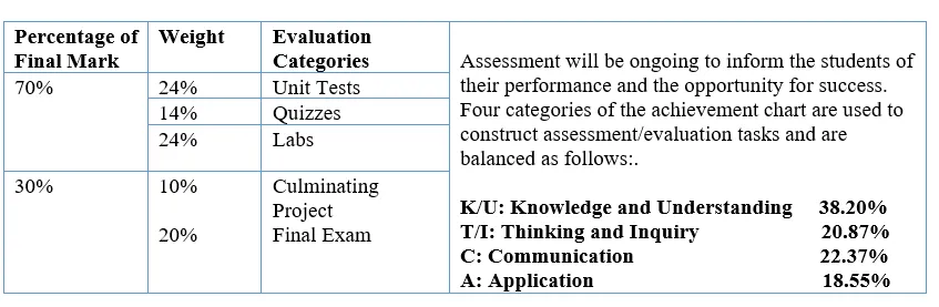 Thirty percent (30%) of the grade will be based on a final evaluation administered at or towards the end of the course. This evaluation will be based on evidence from one or a combination of the following: an examination, a performance, an essay, and/or another method of evaluation suitable to the course content. The final evaluation allows the student an opportunity to demonstrate comprehensive achievement of the overall expectations for the course.