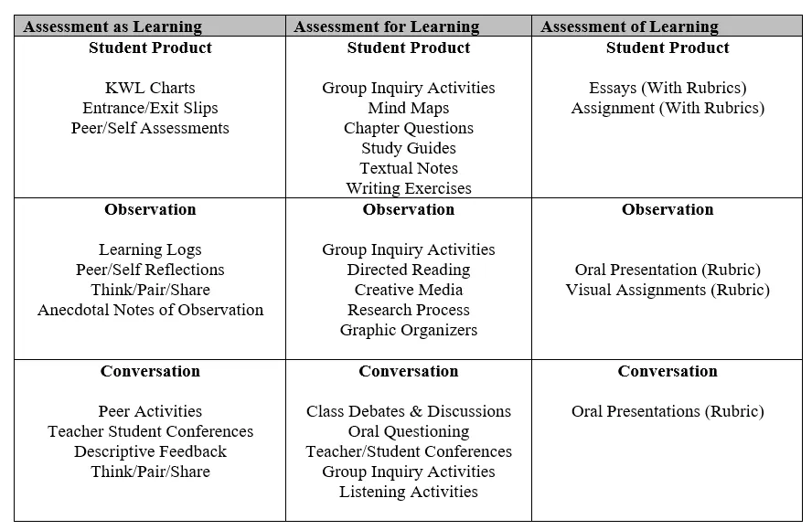Assessment as Learning: focuses on the explicit fostering of students’ capacity over time to be their own best assessors, but teachers need to start by presenting and modelling external, structured opportunities for students to assess themselves.