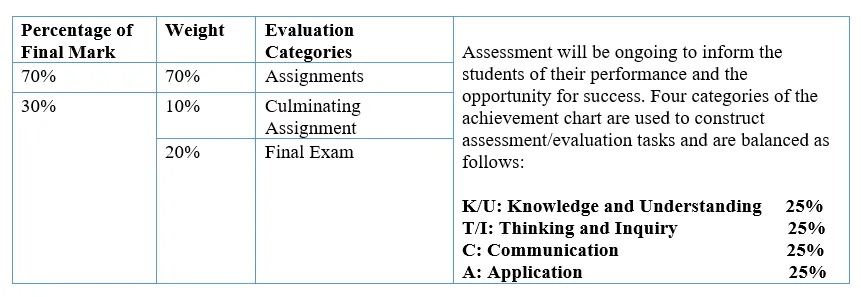 Thirty percent (30%) of the grade will be based on a final evaluation administered at or towards the end of the course. This evaluation will be based on evidence from one or a combination of the following: an examination, a performance, an essay, and/or another method of evaluation suitable to the course content. The final evaluation allows the student an opportunity to demonstrate comprehensive achievement of the overall expectations for the course.