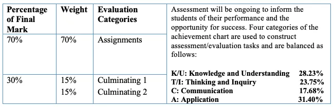 Thirty percent (30%) of the grade will be based on a final evaluation administered at or towards the end of the course. This evaluation will be based on evidence from one or a combination of the following: an examination, a performance, an essay, and/or another method of evaluation suitable to the course content. The final evaluation allows the student an opportunity to demonstrate comprehensive achievement of the overall expectations for the course.